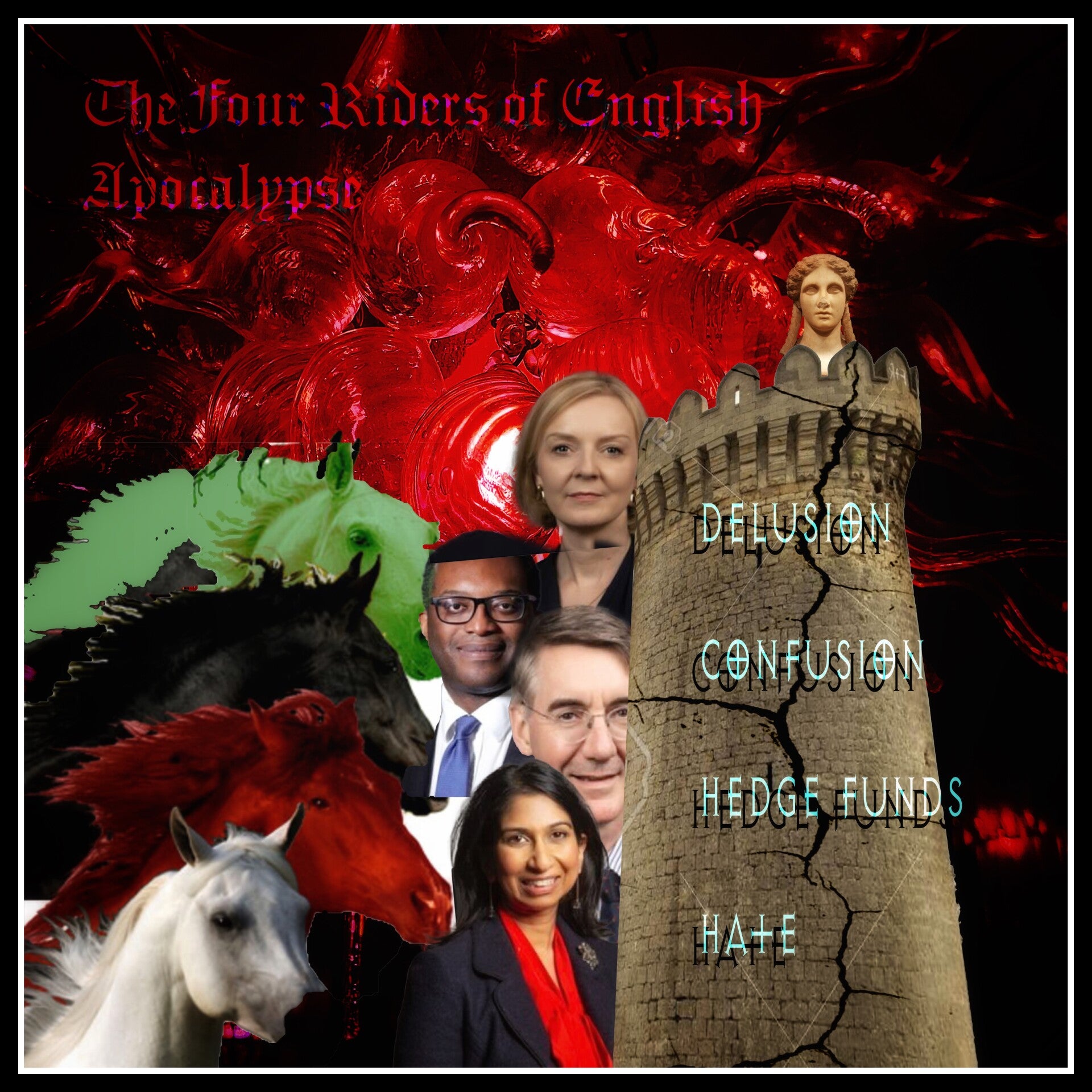 3:26-31 And in the last days of the Blue Pestilence, it came to pass that the four Riders of Destruction stood in front of their horses! 27 The first was green and it carried delusion. 28 the black horse carried confusion. 29 The red one carried hedge funds and the white horse carried hate! 30 And thus the wrath of the Heavens descended upon the Kingdom of the Cold Seas, which lasted for five and twenty years, which was also the time when the last inflicted souls with the Blue Pestilence were healed by the grace of reason. 31 Amen