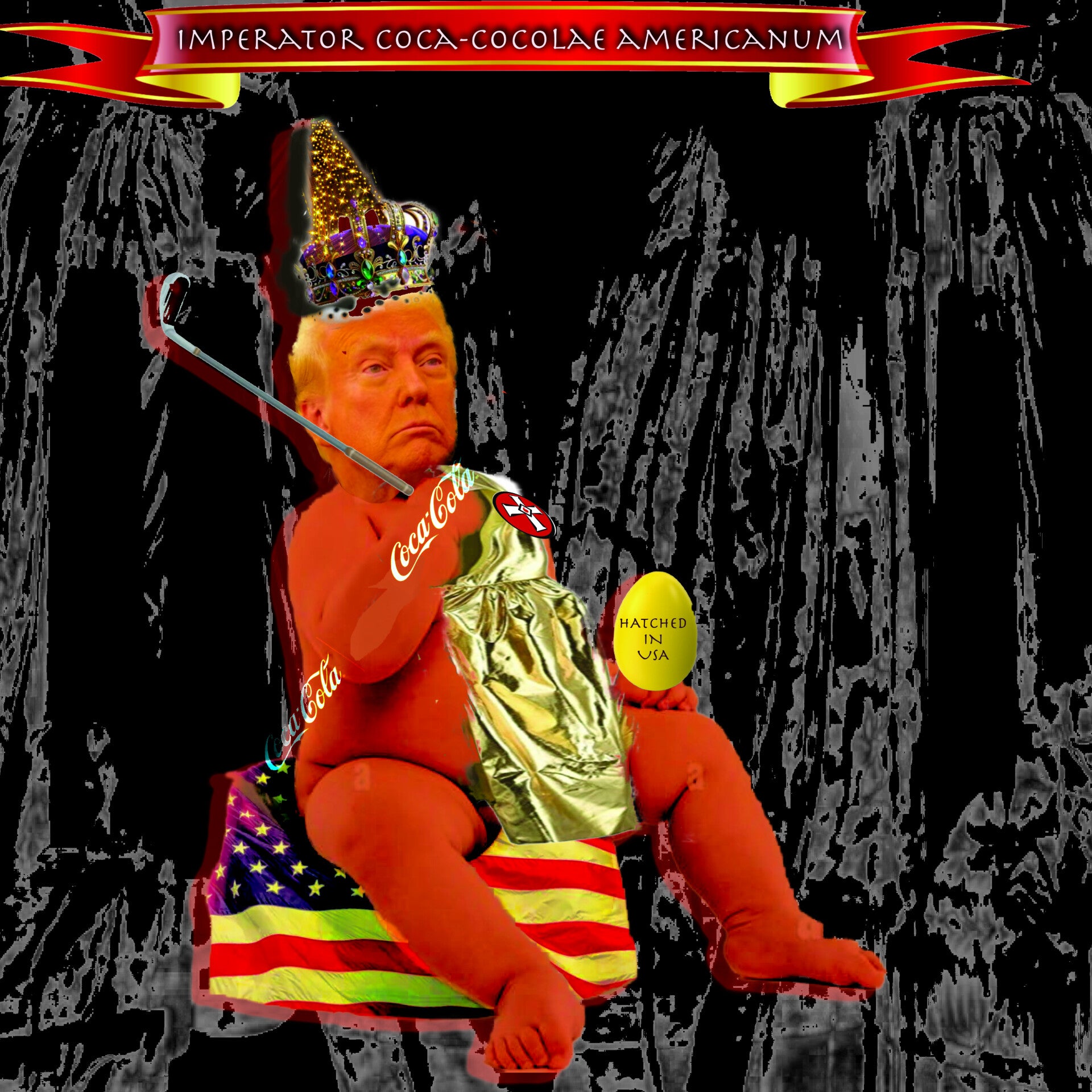 Imperator Coca-Colae Americanensis aka the #childemperor #donaldtrump à l'orange! As #america does not have much history, a huge egg had to replace the coronation orb, a golf stick replaced the mace while Christmas lights replaced the #crownjewels, which also don't exist in #usa! Bowling balls were used as and ingenious system to install a patriotic potty for the child to use as a first throne in America's short history! A shimmering sash was donated by #Cocacola, of course 😂